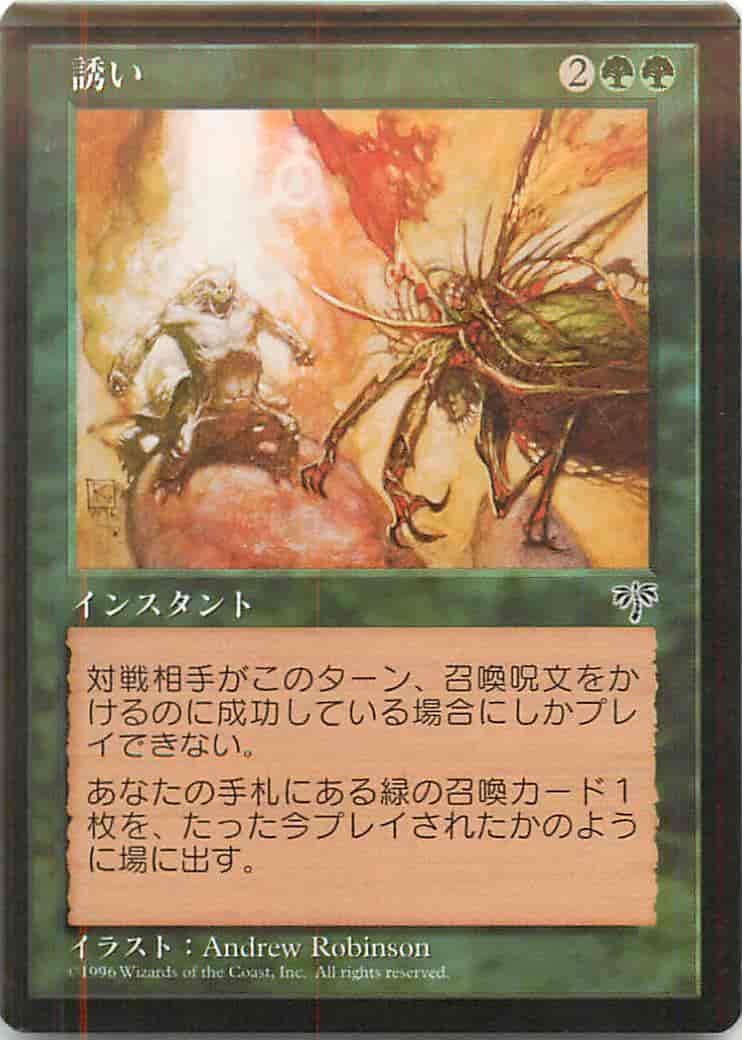 誘いは、このターンに対戦相手1人がクリーチャー呪文を唱えた場合にのみ唱えられる。 あなたは、あなたの手札にある緑のクリーチャー・カードを1枚戦場に出してもよい。