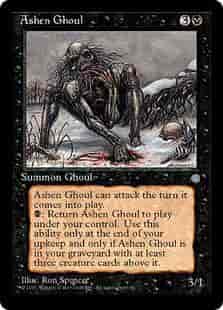 Haste {B}: Return Ashen Ghoul from your graveyard to the battlefield. Activate this ability only during your upkeep and only if three or more creature cards are above Ashen Ghoul.