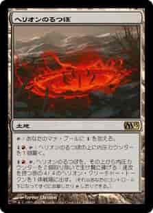 (T):あなたのマナ・プールに(◇)を加える。 (1)(赤),(T):ヘリオンのるつぼの上に内圧(pressure)カウンターを1個置く。 (1)(赤),(T),ヘリオンのるつぼから内圧カウンターを2個取り除くとともに生け贄に捧げる:速攻を持つ赤の4/4のヘリオン(Hellion)・クリーチャー・トークンを1体生成する。(それは、あなたのコントロール下になってすぐに攻撃したり(T)したりできる。)