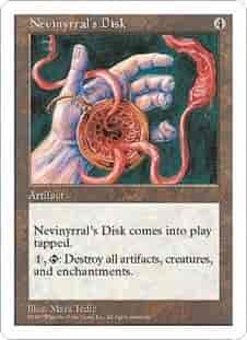 Nevinyrral's Disk enters the battlefield tapped. {1}, {T}: Destroy all artifacts, creatures, and enchantments.