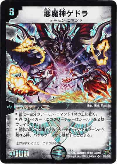進化-自分のデーモン・コマンド1体の上に置く。W・ブレイカー(このクリーチャーはシールドを2枚ブレイクする)相手の呪文の効果でこのクリーチャーがバトルゾーンから離れる時、バトルゾーンから離れずにとどまる。世界が終わろうと、ゲドラは不滅。