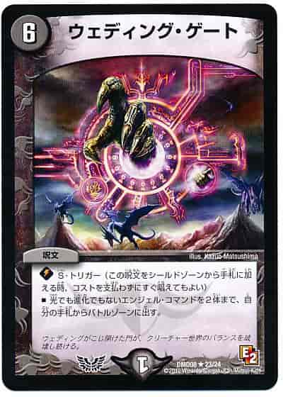 S・トリガー(この呪文をシールドゾーンから手札に加える時、コストを支払わずにすぐ唱えてもよい)光でも進化でもないエンジェル・コマンドを2体まで、自分の手札からバトルゾーンに出す。ウェディングがこじ開けた門が、クリーチャー世界のバランスを破壊し続ける。