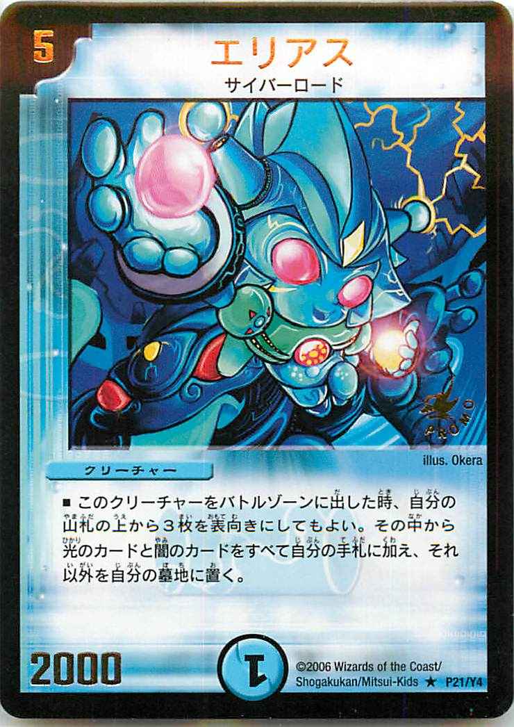 このクリーチャーをバトルゾーンに出した時、自分の山札の上から3枚を表向きにしてもよい。その中から光のカードと闇のカードをすべて自分の手札に加え、それ以外を自分の墓地に置く。 フレーバー:力は力。一度手にした強さは決して失われない。