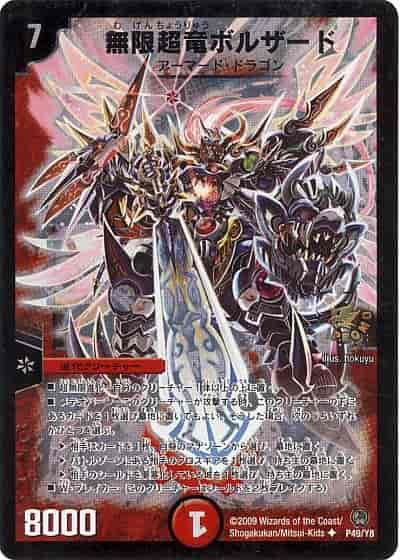 超無限進化-自分のクリーチャー1体以上の上に置く。メテオバーン-このクリーチャーが攻撃する時、このクリーチャーの下にあるカードを1枚選び墓地に置いてもよい。そうした場合、次のうちいずれかひとつを選ぶ。?相手はカードを1枚、自身のマナゾーンから選び、墓地に置く。?バトルゾーンにある相手のクロスギアを1枚選び、持ち主の墓地に置く。?相手のシールドを要塞化している城を1枚選び、持ち主の墓地に置く。W・ブレイカー(このクリーチャーはシールドを2枚ブレイクする)。