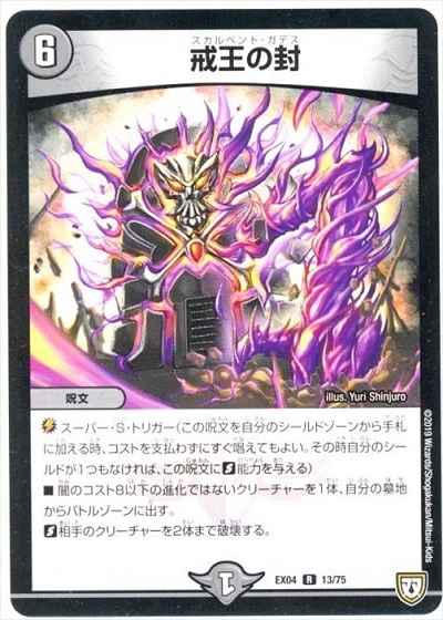 ■スーパー・S・トリガー(この呪文を自分のシールドゾーンから手札に加える時、コストを支払わずにすぐ唱えてもよい。その時自分のシールドが1つもなければ、この呪文に◎能力を与える)■闇のコスト8以下の進化ではないクリーチャーを1体、自分の墓地からバトルゾーンに出す。■◎相手のクリーチャーを2体まで破壊する。