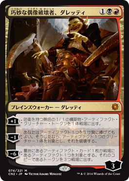 [+1]:防衛を持つ無色の1/1の構築物(Construct)アーティファクト・クリーチャー・トークンを1体生成する。 [-1]:あなたはアーティファクト1つを生け贄に捧げてもよい。そうしたなら、アーティファクト1つかクリーチャー1体を対象とし、それを破壊する。 [-6]:墓地にあるアーティファクト・カード1枚か戦場にあるアーティファクト1つを対象とする。それのコピーであるトークンを3つ生成する。