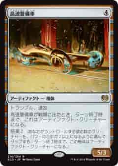 トランプル、速攻 高速警備車が戦場に出たとき、ターン終了時まで、これはアーティファクト・クリーチャーになる。 搭乗2(あなたがコントロールする望む数のクリーチャーを、パワーの合計が2以上になるように選んでタップする:ターン終了時まで、この機体(Vehicle)はアーティファクト・クリーチャーになる。)