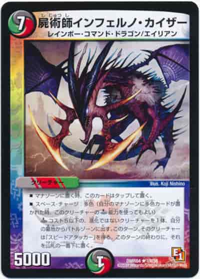 マナゾーンに置く時、このカードはタップして置く。スペース・チャージ:多色(自分のマナゾーンに多色カードが置かれた時、このクリーチャーの 能力を使ってもよい) コスト5以下の、進化ではないクリーチャーを1体、自分の墓地からバトルゾーンに出す。このターン、そのクリーチャーは「スピードアタッカー」を得る。このターンの終わりに、それを山札の一番下に置く。