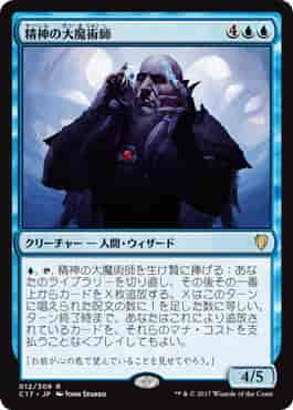 (青),(T),精神の大魔術師を生け贄に捧げる:あなたのライブラリーを切り直し、その後その一番上からカードをX枚追放する。Xは、このターンに唱えられた呪文の数に1を足した数に等しい。ターン終了時まで、あなたはこれにより追放されているカードを、それらのマナ・コストを支払うことなくプレイしてもよい。