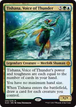 轟く声、ティシャーナのパワーとタフネスは、それぞれあなたの手札にあるカードの枚数に等しい。 あなたの手札の上限はなくなる。 轟く声、ティシャーナが戦場に出たとき、あなたがコントロールしているクリーチャー1体につきカードを1枚引く。
