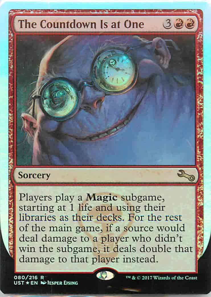 Players play a Magic subgame, starting at 1 life and using their libraries as their decks. For the rest of the main game, if a source would deal damage to a player who didn't win the subgame, it deals double that damage to that player instead.