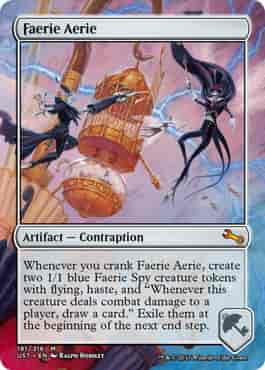 Whenever you crank Faerie Aerie, create two 1/1 blue Faerie Spy creature tokens with flying, haste, and "Whenever this creature deals combat damage to a player, draw a card." Exile them at the beginning of the next end step.