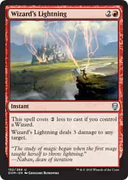 This spell costs {2} less to cast if you control a Wizard. Wizard's Lightning deals 3 damage to any target.