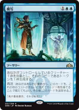あなたがコントロールしているクリーチャー1体を対象とし、それのコピーであるトークンを1体生成する。再活(あなたはあなたの墓地から、このカードを、これの他のコストの支払いに加えてカード1枚を捨てることで唱えてもよい。その後、このカードを追放する。)