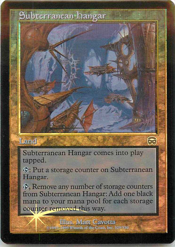 Subterranean Hangar enters the battlefield tapped. {T}: Put a storage counter on Subterranean Hangar. {T}, Remove any number of storage counters from Subterranean Hangar: Add {B} for each storage counter removed this way.