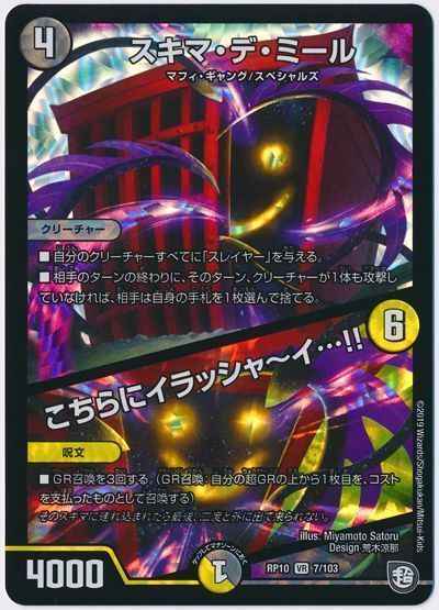 ■自分のクリーチャーすべてに「スレイヤー」を与える。■相手のターンの終わりに、そのターン、クリーチャーが1体も攻撃していなければ、相手は自身の手札を1枚選んで捨てる。/■GR召喚を3回する。