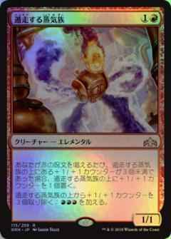 あなたが赤の呪文を唱えるたび、遁走する蒸気族の上に+1/+1カウンターが3個未満であった場合、遁走する蒸気族の上に+1/+1カウンターを1個置く。遁走する蒸気族の上から+1/+1カウンターを3個取り除く:(赤)(赤)(赤)を加える。