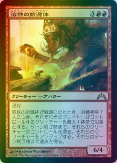 速攻 溶鉄の始源体が戦場に出たとき、対戦相手1人につき、それぞれそのプレイヤーがコントロールするクリーチャーを最大1体まで対象とする。ターン終了時まで、それらのクリーチャーのコントロールを得る。それらのクリーチャーをアンタップする。それらはターン終了時まで速攻を得る。