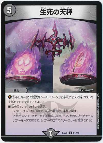 ■S・トリガー■次のうちいずれかひとつを選ぶ。・クリーチャーを2体、自分の墓地から手札に戻す。・相手のクリーチャーを1体選ぶ。このターン、そのクリーチャーのパワーを-5000する。