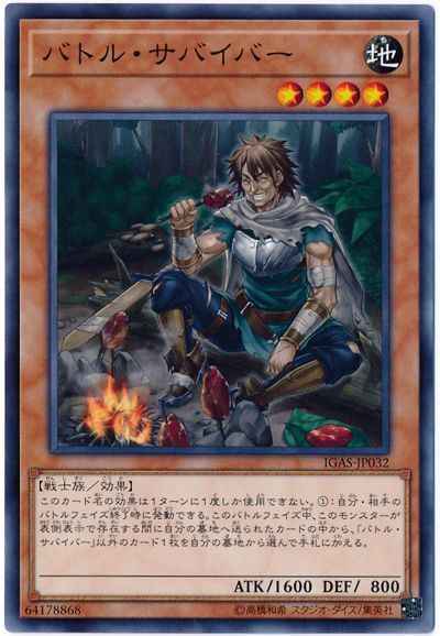 このバトルフェイズ中、このモンスターが表側表示で存在する間に自分の墓地へ送られたカードの中から、「バトル・サバイバー」以外のカード1枚を自分の墓地から選んで手札に加える。