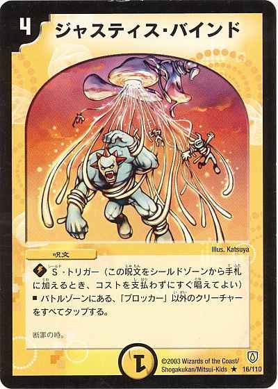 S(シールド)・トリガー(この呪文をシールドゾーンから手札に加えるとき、コストを支払わずにすぐ唱えてよい)バトルゾーンにある、「ブロッカー」以外のクリーチャーをすべてタップする。断罪の時。