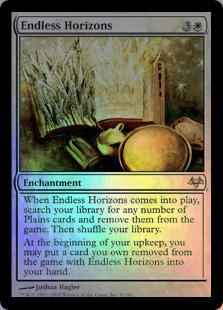 終わり無き地平線が戦場に出たとき、あなたのライブラリーから望む数の平地(Plains)カードを探し、それらを追放してもよい。その後、あなたのライブラリーを切り直す。 あなたのアップキープの開始時に、あなたは終わり無き地平線によって追放されたあなたがオーナーであるカードを1枚、あなたの手札に加えてもよい。