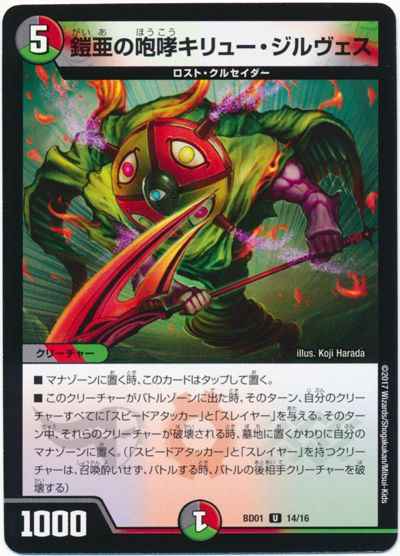 マナゾーンに置く時、このカードはタップして置く。このクリーチャーをバトルゾーンに出した時、そのターン、自分のクリーチャーはすべて「スピードアタッカー」と「スレイヤー」を得る。そのターン中、それらのクリーチャーが破壊される時、墓地に置くかわりに自分のマナゾーンに置く。 フレーバー:この一瞬に勝利の咆哮を上げよ!