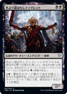 死より選ばれしティマレットのタフネスは、あなたの黒への信心に等しい。(あなたの黒への信心とは、あなたがコントロールしているパーマネントのマナ・コストに含まれる(黒)の総数である。)