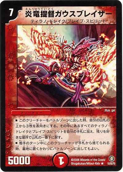 このクリーチャーをバトルゾーンに出した時、自分の山札の上から3枚を表向きにする。その中にあるすべてのティラノ・ドレイクとブレイブ・スピリットを自分の手札に加え、残りを好きな順序で山札の一番下に戻す。相手のターン中にこのクリーチャーが手札から捨てられる時、墓地に置くかわりにバトルゾーンに出してもよい。