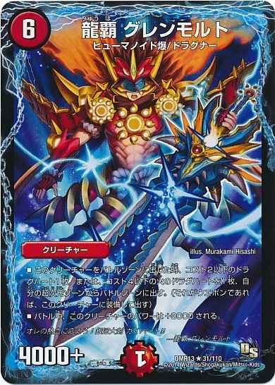 このクリーチャーをバトルゾーンに出した時、コスト2以下のドラグハート1枚、または、コスト4以下の火のドラグハートを1枚、自分の超次元ゾーンからバトルゾーンに出す。(それがウエポンであれば、このクリーチャーに装備して出す)。バトル中、このクリーチャーのパワーは+3000される。 フレーバー:オレの熱血に応えろ!銀河大剣 ガイハート!! ---龍覇 グレンモルト