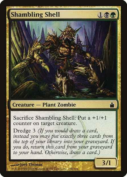 Sacrifice Shambling Shell: Put a +1/+1 counter on target creature. Dredge 3 (If you would draw a card, instead you may put exactly three cards from the top of your library into your graveyard. If you do, return this card from your graveyard to your hand. Otherwise, draw a card.)