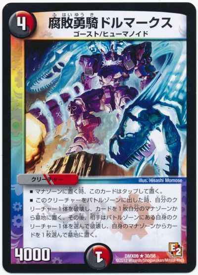 マナゾーンに置く時、このカードはタップして置く。このクリーチャーをバトルゾーンに出した時、自分のクリーチャー1体を破壊し、カードを1枚自分のマナゾーンから墓地に置く。その後、相手はバトルゾーンにある自身のクリーチャー1体を選んで破壊し、自身のマナゾーンからカードを1枚選んで墓地に置く。