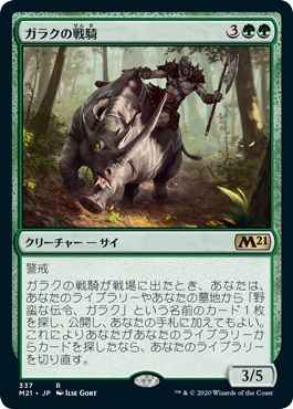 ガラクの戦騎が戦場に出たとき、あなたは、あなたのライブラリーやあなたの墓地から《野蛮な伝令、ガラク/Garruk, Savage Herald》という名前のカード1枚を探し、公開し、あなたの手札に加えてもよい。これによりあなたがあなたのライブラリーを探したなら、あなたのライブラリーを切り直す。