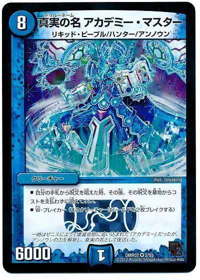 自分の手札から呪文を唱えた時、その後、その呪文を墓地からコストを支払わずに唱えてよい。W・ブレイカー(このクリーチャーはシールドを2枚ブレイクする)一時はゼニスによって壊滅状態に追い込まれた「アカデミー」だったが、アンノウンの力を解析し、真実の名として復活した。