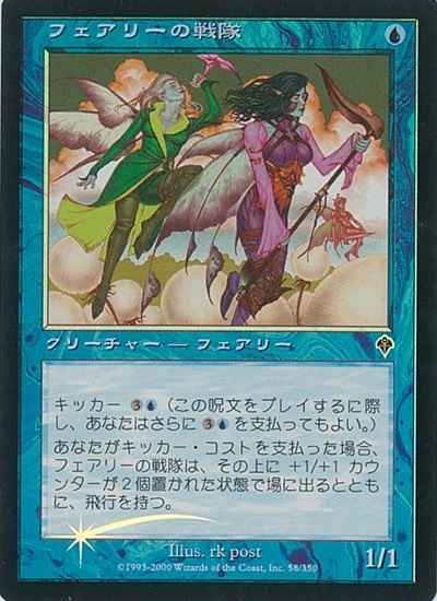 キッカー(3)(青)(あなたがこの呪文を唱えるに際し、あなたは追加の(3)(青)を支払ってもよい。) フェアリーの戦隊がキッカーされていた場合、それはその上に+1/+1カウンターが2個置かれた状態で戦場に出るとともに、飛行を持つ。