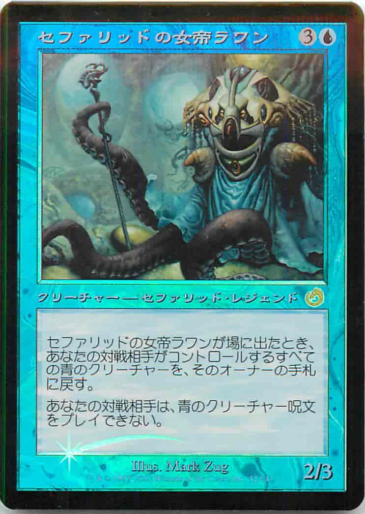 セファリッドの女帝ラワンが戦場に出たとき、あなたの対戦相手がコントロールするすべての青のクリーチャーを、オーナーの手札に戻す。 あなたの対戦相手は、青のクリーチャー呪文を唱えられない。