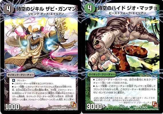 ループ覚醒-このクリーチャーがブロックした時または攻撃された時、自分の山札の上から2枚を墓地に置き、その後、このクリーチャーを《時空のハイド ジオ・マッチョ》のほうに裏返す。(攻撃は中止されない)(ゲーム開始時、サイキック・クリーチャーは山札には含めず、自分の超次元ゾーンに置き、バトルゾーン以外のゾーンに行った場合、そこに戻す)